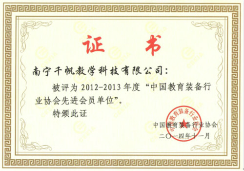 中國(guó)教育裝備行業(yè)協(xié)會(huì)先進(jìn)會(huì)員單位證書